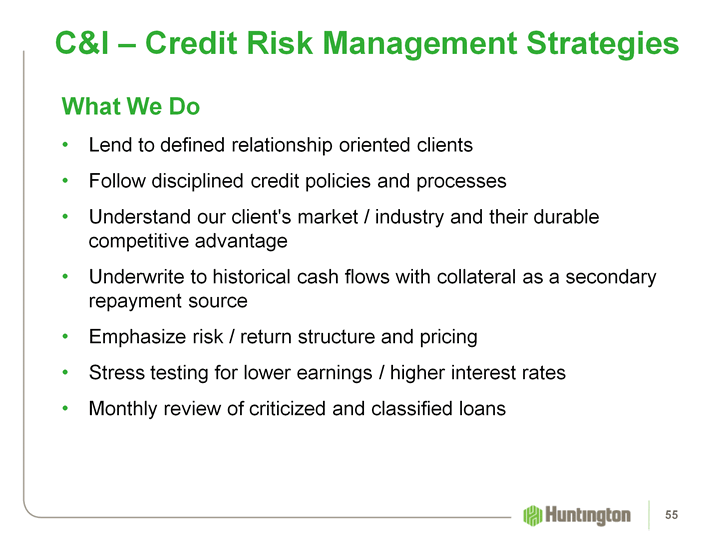 | C&I - Credit Risk Management Strategies What We Do Lend to defined relationship oriented clients Follow disciplined credit policies and processes Understand our client's market / industry and their durable competitive advantage Underwrite to historical cash flows with collateral as a secondary repayment source Emphasize risk / return structure and pricing Stress testing for lower earnings / higher interest rates Monthly review of criticized and classified loans 55 |