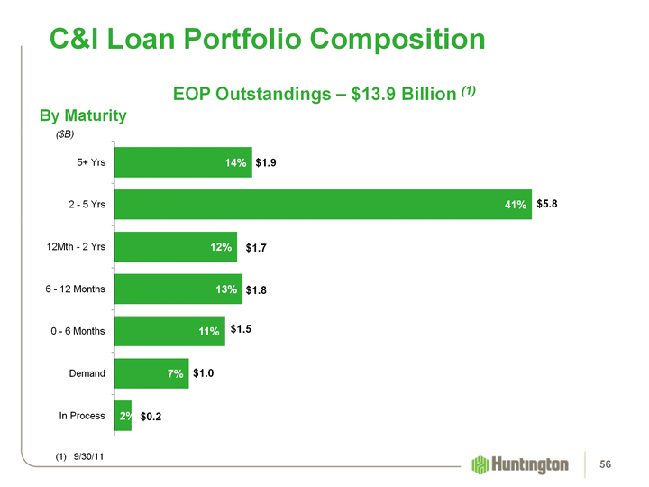 | (CHART) C&I Loan Portfolio Composition ($B) EOP Outstandings - $13.9 Billion (1) (1) 9/30/11 By Maturity $1.9 $5.8 $1.7 $1.8 $1.5 $1.0 $0.2 56 |