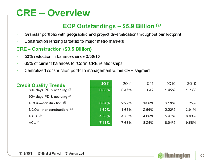 | CRE - Overview EOP Outstandings - $5.9 Billion (1) Granular portfolio with geographic and project diversification throughout our footprint Construction lending targeted to major metro markets CRE - Construction ($0.5 Billion) 53% reduction in balances since 6/30/10 65% of current balances to "Core" CRE relationships Centralized construction portfolio management within CRE segment Credit Quality Trends 3Q11 2Q11 1Q11 4Q10 3Q10 30+ days PD & accruing (2) 0.83% 0.45% 1.49 1.45% 1.26% 90+ days PD & accruing (2) -- -- -- -- -- NCOs - construction (3) 0.87% 2.99% 18.6% 6.19% 7.25% NCOs - nonconstruction (3) 1.69% 1.65% 2.66% 2.22% 3.01% NALs (2) 4.33% 4.73% 4.86% 5.47% 6.93% ACL (2) 7.15% 7.63% 8.25% 8.94% 9.58% 60 (1) 9/30/11 (2) End of Period (3) Annualized |