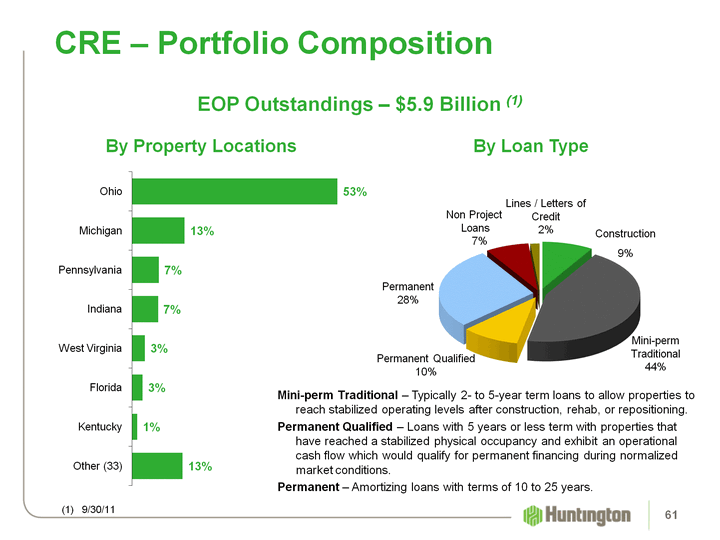 | (CHART) CRE - Portfolio Composition Permanent 28% Mini-perm Traditional 44% Construction 9% Non Project Loans 7% (CHART) Lines / Letters of Credit 2% (1) 9/30/11 Permanent Qualified 10% Mini-perm Traditional - Typically 2- to 5-year term loans to allow properties to reach stabilized operating levels after construction, rehab, or repositioning. Permanent Qualified - Loans with 5 years or less term with properties that have reached a stabilized physical occupancy and exhibit an operational cash flow which would qualify for permanent financing during normalized market conditions. Permanent - Amortizing loans with terms of 10 to 25 years. EOP Outstandings - $5.9 Billion (1) By Loan Type By Property Locations 61 |