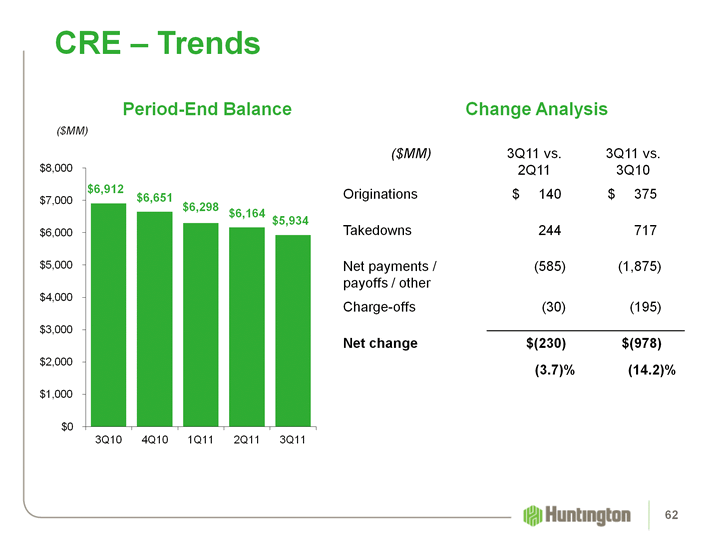 | CRE - Change Analysis 2Q11 Construction Commercial Total CRE March 31, 2011 $587 $5,711 $6,298 New originations 0 87 87 Net pay-offs / takedowns / other 8 (192) (184) Charge-offs (4) (33) (37) June 30, 2011 $591 $5,573 $6,164 Net change $4 $(138) $(134) 3Q11 Construction Commercial Total CRE June 30, 2011 $591 $5,573 $6,164 New originations 0 140 140 Net pay-offs / takedowns / other (67) (273) (340) Charge-offs (4) (25) (30) September 30, 2011 $520 $5,414 $5,934 Net change $(71) $(159) $(230) 63 |