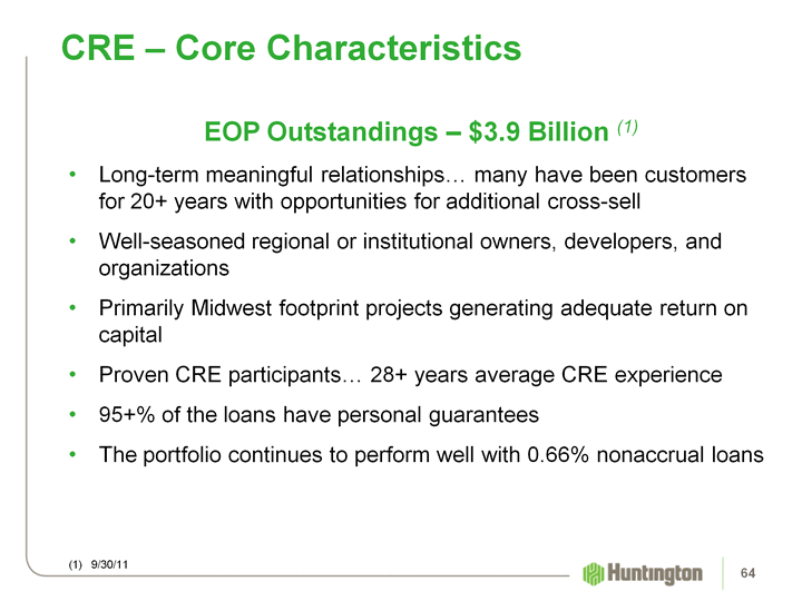 | CRE - Core Characteristics EOP Outstandings - $3.9 Billion (1) Long-term meaningful relationships... many have been customers for 20+ years with opportunities for additional cross-sell Well-seasoned regional or institutional owners, developers, and organizations Primarily Midwest footprint projects generating adequate return on capital Proven CRE participants... 28+ years average CRE experience 95+% of the loans have personal guarantees The portfolio continues to perform well with 0.66% nonaccrual loans (1) 9/30/11 64 |