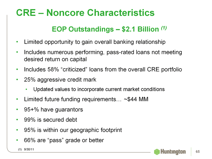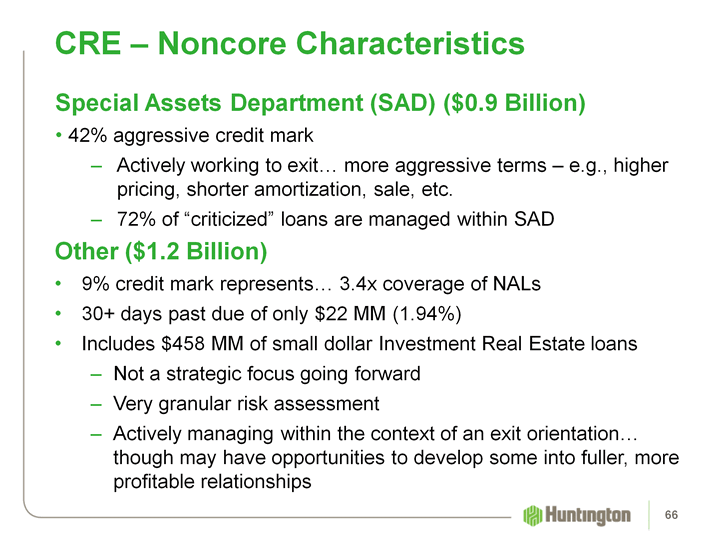 | CRE - Noncore Characteristics EOP Outstandings - $2.1 Billion (1) Limited opportunity to gain overall banking relationship Includes numerous performing, pass-rated loans not meeting desired return on capital Includes 58% "criticized" loans from the overall CRE portfolio 25% aggressive credit mark Updated values to incorporate current market conditions Limited future funding requirements... ~$44 MM 95+% have guarantors 99% is secured debt 95% is within our geographic footprint 66% are "pass" grade or better (1) 9/30/11 65 |