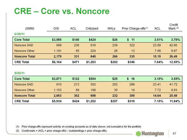 | CRE - Core vs. Noncore ($MM) O/S ACL Criticized NALs Prior Charge-offs(1) ACL Credit Mark (2) 6/30/11 Core Total $3,985 $140 $424 $26 $ 11 3.51% 3.78% Noncore SAD 988 236 616 239 322 23.89 42.60 Noncore Other 1,191 95 224 26 13 7.98 8.97 Noncore Total 2,179 331 840 266 335 15.19 26.49 CRE Total $6,164 $471 $1,263 $292 $346 7.64% 12.55% 9/30/11 Core Total $3,871 $122 $504 $25 $ 16 3.15% 3.55% Noncore SAD 910 213 502 202 286 23.41 41.72 Noncore Other 1,153 89 196 30 14 7.72 8.83 Noncore Total 2,063 302 698 232 300 14.64 25.48 CRE Total $5,934 $424 $1,202 $257 $316 7.15% 11.84% (1) Prior charge-offs represent activity on existing accounts as of date shown, not cumulative for the portfolio (2) Credit mark = (ACL + prior charge-offs) / (outstandings + prior charge-offs) 67 |