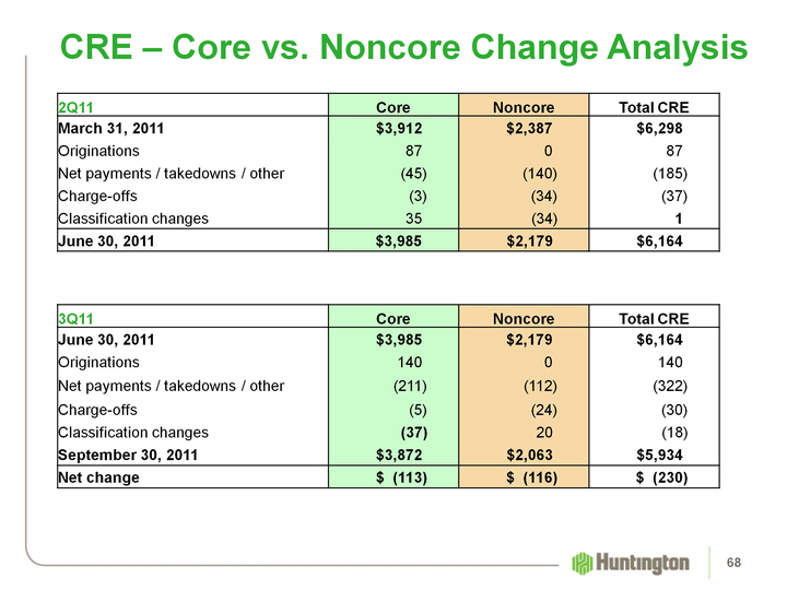 | CRE - Core vs. Noncore Change Analysis 2Q11 Core Noncore Total CRE March 31, 2011 $3,912 $2,387 $6,298 Originations 87 0 87 Net payments / takedowns / other (45) (140) (185) Charge-offs (3) (34) (37) Classification changes 35 (34) 1 June 30, 2011 $3,985 $2,179 $6,164 3Q11 Core Noncore Total CRE June 30, 2011 $3,985 $2,179 $6,164 Originations 140 0 140 Net payments / takedowns / other (211) (112) (322) Charge-offs (5) (24) (30) Classification changes (37) 20 (18) September 30, 2011 $3,872 $2,063 $5,934 Net change $ (113) $ (116) $ (230) 68 |