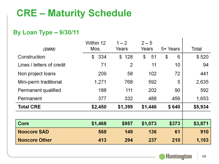 | CRE - Maturity Schedule By Loan Type - 9/30/11 ($MM) Within 12 Mos. 1 - 2 Years 2 - 5 Years 5+ Years Total Construction $ 334 $ 128 $ 51 $ 6 $ 520 Lines / letters of credit 71 2 11 10 94 Non project loans 209 58 102 72 441 Mini-perm traditional 1,271 768 592 5 2,635 Permanent qualified 188 111 202 90 592 Permanent 377 332 488 456 1,653 Total CRE $2,450 $1,399 $1,446 $ 640 $5,934 Core $1,468 $957 $1,073 $373 $3,871 Noncore SAD 568 149 136 61 910 Noncore Other 413 294 237 210 1,153 69 |