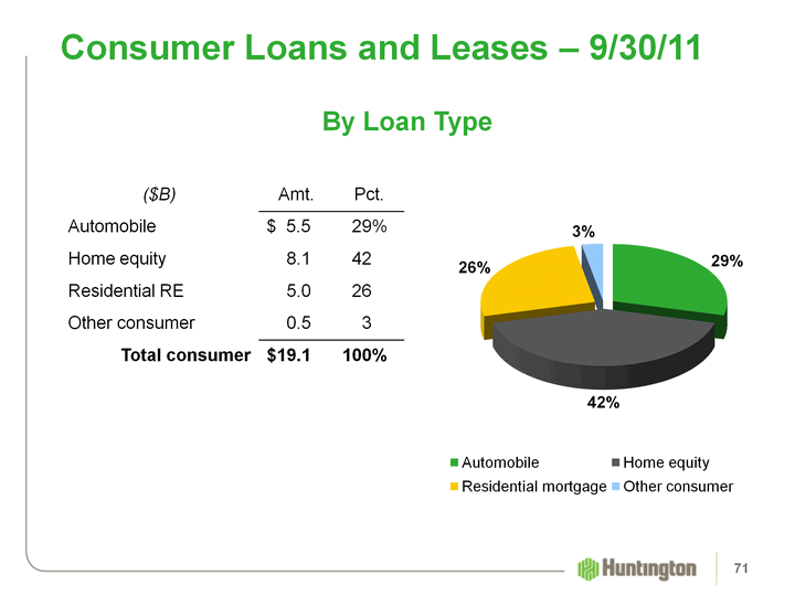 | Consumer Loans and Leases - 9/30/11 ($B) Amt. Pct. Automobile $ 5.5 29% Home equity 8.1 42 Residential RE 5.0 26 Other consumer 0.5 3 Total consumer $19.1 100% (CHART) By Loan Type 71 |