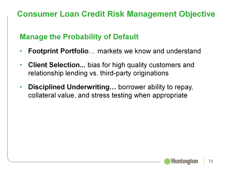 | Consumer Loan Credit Risk Management Objective Manage the Probability of Default Footprint Portfolio... markets we know and understand Client Selection... bias for high quality customers and relationship lending vs. third-party originations Disciplined Underwriting... borrower ability to repay, collateral value, and stress testing when appropriate 72 |