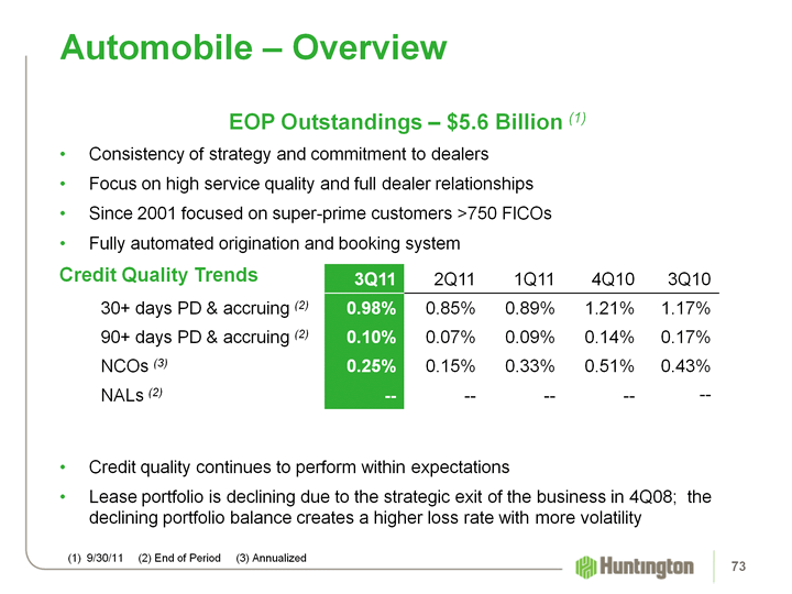 | Automobile - Overview EOP Outstandings - $5.6 Billion (1) Consistency of strategy and commitment to dealers Focus on high service quality and full dealer relationships Since 2001 focused on super-prime customers >750 FICOs Fully automated origination and booking system Credit Quality Trends Credit quality continues to perform within expectations Lease portfolio is declining due to the strategic exit of the business in 4Q08; the declining portfolio balance creates a higher loss rate with more volatility 3Q11 2Q11 1Q11 4Q10 3Q10 30+ days PD & accruing (2) 0.98% 0.85% 0.89% 1.21% 1.17% 90+ days PD & accruing (2) 0.10% 0.07% 0.09% 0.14% 0.17% NCOs (3) 0.25% 0.15% 0.33% 0.51% 0.43% NALs (2) -- -- -- -- -- 73 (1) 9/30/11 (2) End of Period (3) Annualized |