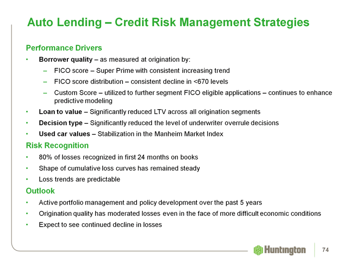 | Auto Lending - Credit Risk Management Strategies Performance Drivers Borrower quality - as measured at origination by: FICO score - Super Prime with consistent increasing trend FICO score distribution - consistent decline in <670 levels Custom Score - utilized to further segment FICO eligible applications - continues to enhance predictive modeling Loan to value - Significantly reduced LTV across all origination segments Decision type - Significantly reduced the level of underwriter overrule decisions Used car values - Stabilization in the Manheim Market Index Risk Recognition 80% of losses recognized in first 24 months on books Shape of cumulative loss curves has remained steady Loss trends are predictable Outlook Active portfolio management and policy development over the past 5 years Origination quality has moderated losses even in the face of more difficult economic conditions Expect to see continued decline in losses 74 |