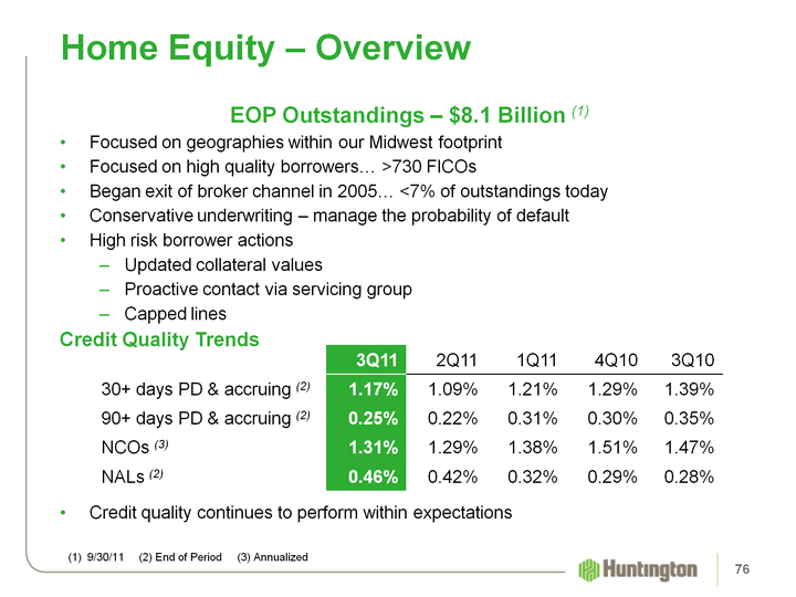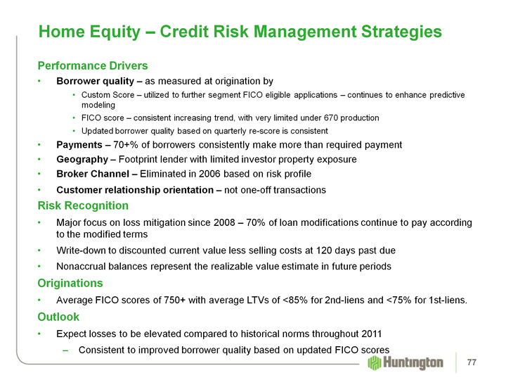 | Home Equity - Overview EOP Outstandings - $8.1 Billion (1) Focused on geographies within our Midwest footprint Focused on high quality borrowers... >730 FICOs Began exit of broker channel in 2005... <7% of outstandings today Conservative underwriting - manage the probability of default High risk borrower actions Updated collateral values Proactive contact via servicing group Capped lines Credit Quality Trends Credit quality continues to perform within expectations 3Q11 2Q11 1Q11 4Q10 3Q10 30+ days PD & accruing (2) 1.17% 1.09% 1.21% 1.29% 1.39% 90+ days PD & accruing (2) 0.25% 0.22% 0.31% 0.30% 0.35% NCOs (3) 1.31% 1.29% 1.38% 1.51% 1.47% NALs (2) 0.46% 0.42% 0.32% 0.29% 0.28% 76 (1) 9/30/11 (2) End of Period (3) Annualized |