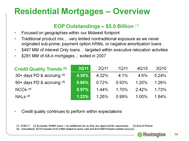 | EOP Outstandings - $5.0 Billion (1) Focused on geographies within our Midwest footprint Traditional product mix... very limited nontraditional exposure as we never originated sub-prime, payment option ARMs, or negative amortization loans $497 MM of Interest Only loans... targeted within executive relocation activities $281 MM of Alt-A mortgages... exited in 2007 Credit Quality Trends (2) Credit quality continues to perform within expectations 3Q11 2Q11 1Q11 4Q10 3Q10 30+ days PD & accruing (3) 4.30% 4.32% 4.1% 4.6% 5.24% 90+ days PD & accruing (3) 0.66% 0.72% 0.93% 1.20% 1.26% NCOs (4) 0.97% 1.44% 1.70% 2.42% 1.73% NALs (3) 1.23% 1.26% 0.99% 1.00% 1.84% Residential Mortgages - Overview 78 9/30/11 (2) Excludes GNMA loans - no additional risk as they are approved for repurchase (3) End of Period (4) Annualized; 4Q10 includes $16.4 MM related to loans sold and $4.6 MM Franklin-related recovery |