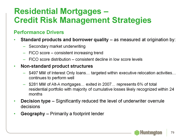 | Residential Mortgages - Credit Risk Management Strategies Performance Drivers Standard products and borrower quality - as measured at origination by: Secondary market underwriting FICO score - consistent increasing trend FICO score distribution - consistent decline in low score levels Non-standard product structures $497 MM of Interest Only loans... targeted within executive relocation activities... continues to perform well $281 MM of Alt-A mortgages... exited in 2007... represents 6% of total residential portfolio with majority of cumulative losses likely recognized within 24 months Decision type - Significantly reduced the level of underwriter overrule decisions Geography - Primarily a footprint lender 79 |