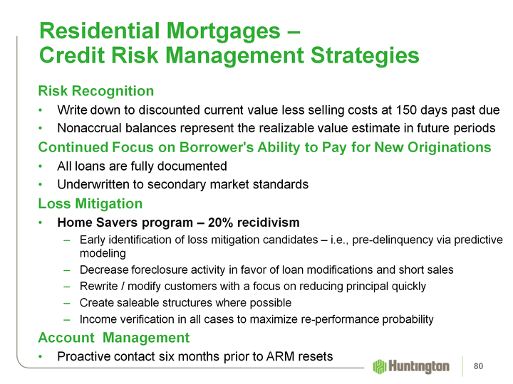 | Residential Mortgages - Credit Risk Management Strategies Risk Recognition Write down to discounted current value less selling costs at 150 days past due Nonaccrual balances represent the realizable value estimate in future periods Continued Focus on Borrower's Ability to Pay for New Originations All loans are fully documented Underwritten to secondary market standards Loss Mitigation Home Savers program - 20% recidivism Early identification of loss mitigation candidates - i.e., pre-delinquency via predictive modeling Decrease foreclosure activity in favor of loan modifications and short sales Rewrite / modify customers with a focus on reducing principal quickly Create saleable structures where possible Income verification in all cases to maximize re-performance probability Account Management Proactive contact six months prior to ARM resets 80 |