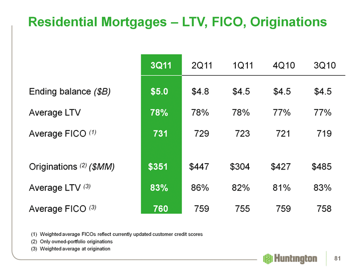 | Residential Mortgages - LTV, FICO, Originations (1) Weighted average FICOs reflect currently updated customer credit scores (2) Only owned-portfolio originations Weighted average at origination 3Q11 2Q11 1Q11 4Q10 3Q10 Ending balance ($B) $5.0 $4.8 $4.5 $4.5 $4.5 Average LTV 78% 78% 78% 77% 77% Average FICO (1) 731 729 723 721 719 Originations (2) ($MM) $351 $447 $304 $427 $485 Average LTV (3) 83% 86% 82% 81% 83% Average FICO (3) 760 759 755 759 758 81 |