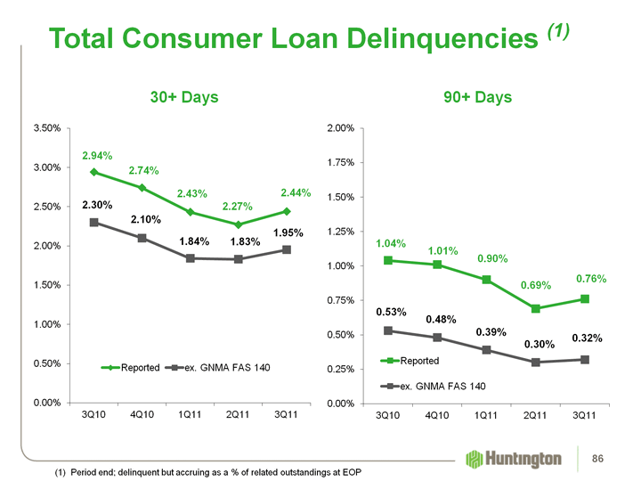 | (CHART) Total Consumer Loan Delinquencies (1) (CHART) 90+ Days 30+ Days (1) Period end; delinquent but accruing as a % of related outstandings at EOP 86 |