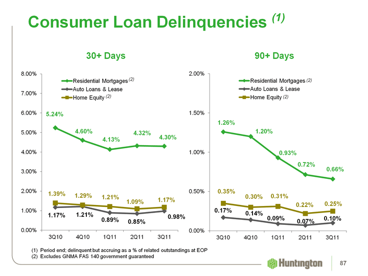| Consumer Loan Delinquencies (1) (CHART) (1) Period end; delinquent but accruing as a % of related outstandings at EOP (2) Excludes GNMA FAS 140 government guaranteed (CHART) (2) (2) (2) (2) 90+ Days 30+ Days 87 |