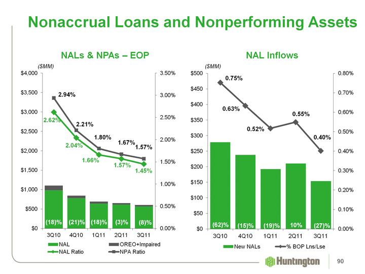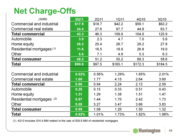 | Net Charge-Offs ($MM) 3Q11 2Q11 1Q11 4Q10 3Q10 Commercial and industrial $17.9 $18.7 $42.2 $59.1 $62.2 Commercial real estate 24.4 27.6 67.7 44.9 63.7 Total commercial 42.3 46.3 109.9 104.0 125.9 Automobile 3.9 2.3 4.7 7.0 5.6 Home equity 26.2 25.4 26.7 29.2 27.8 Residential mortgages (1) 11.6 16.5 18.9 26.8 19.0 Other 6.6 7.1 4.9 5.3 6.3 Total consumer 48.2 51.2 55.2 68.3 58.6 Total $90.6 $97.5 $165.1 $172.3 $184.5 Commercial and industrial 0.52% 0.56% 1.29% 1.85% 2.01% Commercial real estate 1.60 1.77 4.15 2.64 3.60 Total commercial 0.86 0.94 2.24 2.13 2.59 Automobile 0.25 0.15 0.33 0.51 0.43 Home equity 1.31 1.29 1.38 1.51 1.47 Residential mortgages (2) 0.97 1.44 1.70 2.42 1.73 Other 5.05 5.27 3.47 3.66 3.83 Total consumer 0.99 1.08 1.20 1.50 1.32 Total 0.92% 1.01% 1.73% 1.82% 1.98% 4Q10 Includes $16.4 MM related to the sale of $39.8 MM of residential mortgages 89 |