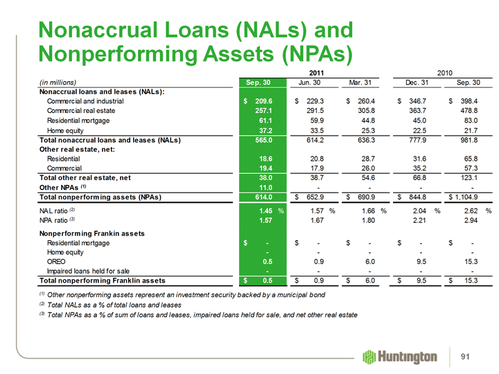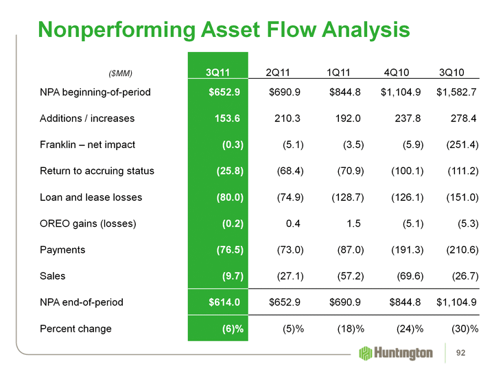 | ($MM) 3Q11 2Q11 1Q11 4Q10 3Q10 NPA beginning-of-period $652.9 $690.9 $844.8 $1,104.9 $1,582.7 Additions / increases 153.6 210.3 192.0 237.8 278.4 Franklin - net impact (0.3) (5.1) (3.5) (5.9) (251.4) Return to accruing status (25.8) (68.4) (70.9) (100.1) (111.2) Loan and lease losses (80.0) (74.9) (128.7) (126.1) (151.0) OREO gains (losses) (0.2) 0.4 1.5 (5.1) (5.3) Payments (76.5) (73.0) (87.0) (191.3) (210.6) Sales (9.7) (27.1) (57.2) (69.6) (26.7) NPA end-of-period $614.0 $652.9 $690.9 $844.8 $1,104.9 Percent change (6)% (5)% (18)% (24)% (30)% Nonperforming Asset Flow Analysis 92 |