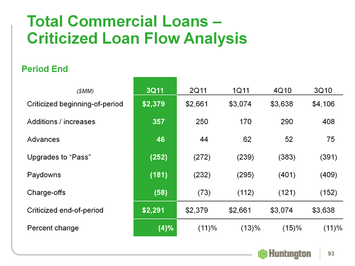 | ($MM) 3Q11 2Q11 1Q11 4Q10 3Q10 Criticized beginning-of-period $2,379 $2,661 $3,074 $3,638 $4,106 Additions / increases 357 250 170 290 408 Advances 46 44 62 52 75 Upgrades to "Pass" (252) (272) (239) (383) (391) Paydowns (181) (232) (295) (401) (409) Charge-offs (58) (73) (112) (121) (152) Criticized end-of-period $2,291 $2,379 $2,661 $3,074 $3,638 Percent change (4)% (11)% (13)% (15)% (11)% Total Commercial Loans - Criticized Loan Flow Analysis Period End 93 |