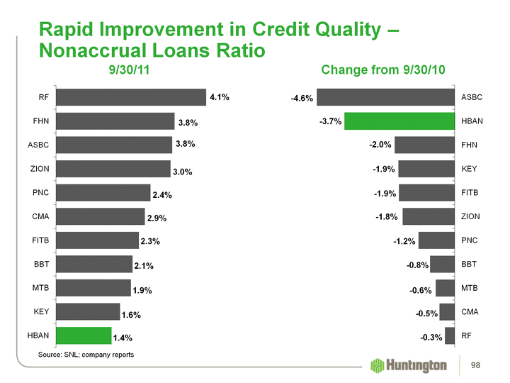 | Rapid Improvement in Credit Quality - Nonaccrual Loans Ratio 9/30/11 Change from 9/30/10 (CHART) Source: SNL; company reports (CHART) 98 |