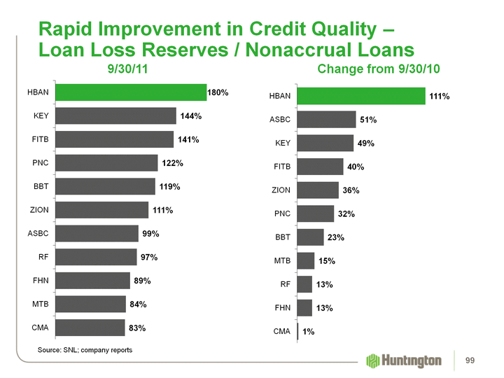 | Rapid Improvement in Credit Quality - Loan Loss Reserves / Nonaccrual Loans (CHART) (CHART) Source: SNL; company reports 9/30/11 Change from 9/30/10 99 |