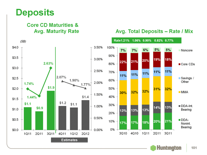 | (CHART) (CHART) Deposits ($B) Avg. Total Deposits - Rate / Mix Core CD Maturities & Avg. Maturity Rate Rate1.21% 1.06% 0.90% 0.82% 0.77% Estimates 101 |