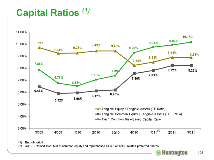 | (CHART) Capital Ratios (1) End-of-period 4Q10 - Raised $920 MM of common equity and repurchased $1.4 B of TARP related preferred shares (2) 108 |