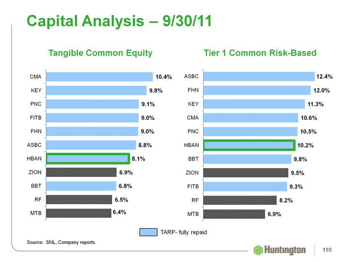 | (CHART) Capital Analysis - 9/30/11 (CHART) Source: SNL, Company reports. Tier 1 Common Risk-Based Tangible Common Equity TARP- fully repaid 110 |