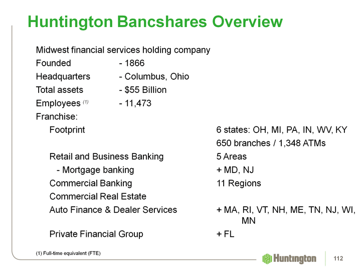 | Huntington Bancshares Overview Midwest financial services holding company Founded - 1866 Headquarters - Columbus, Ohio Total assets - $55 Billion Employees (1) - 11,473 Franchise: Footprint 6 states: OH, MI, PA, IN, WV, KY 650 branches / 1,348 ATMs Retail and Business Banking 5 Areas - Mortgage banking + MD, NJ Commercial Banking 11 Regions Commercial Real Estate Auto Finance & Dealer Services + MA, RI, VT, NH, ME, TN, NJ, WI, MN Private Financial Group + FL (1) Full-time equivalent (FTE) 112 |