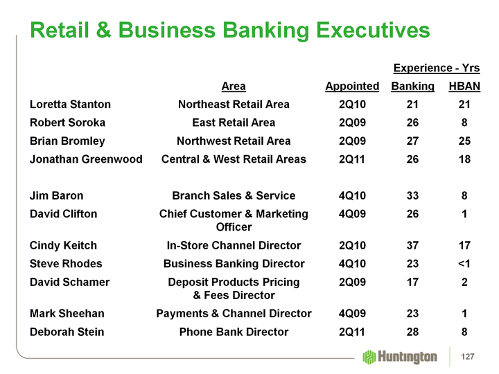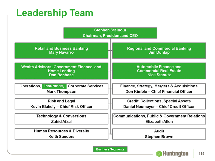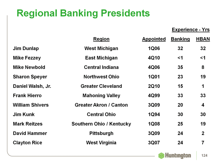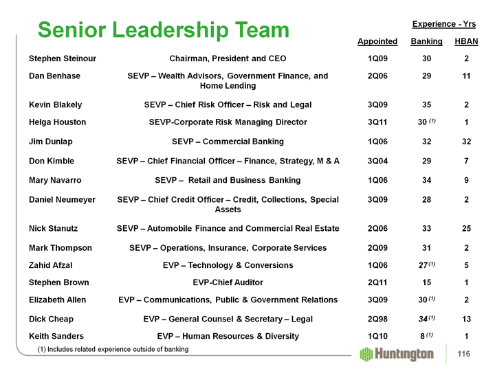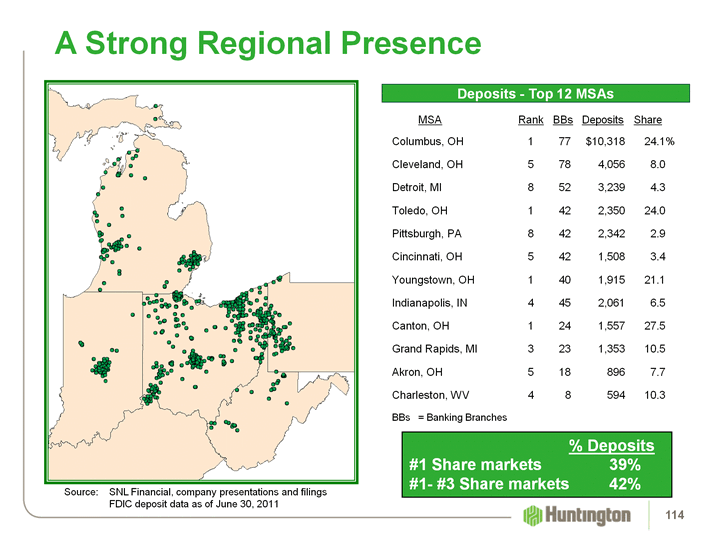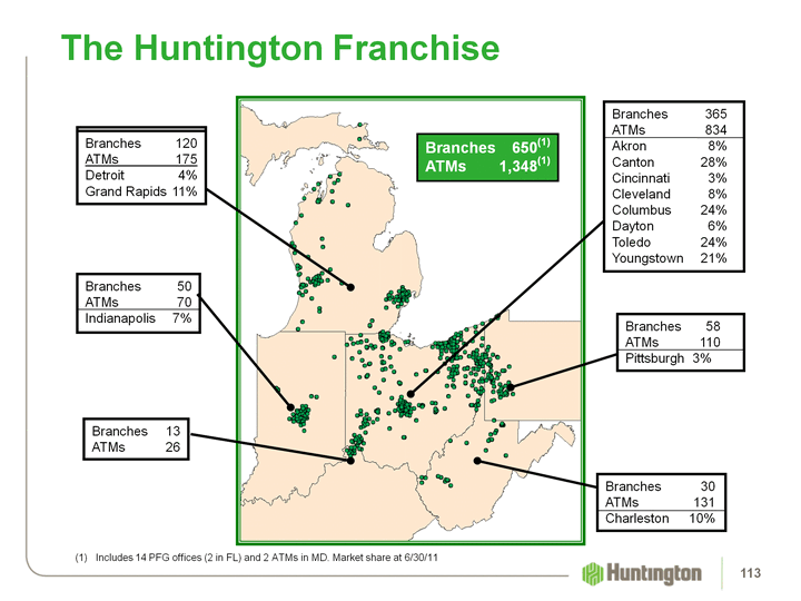 | The Huntington Franchise Branches 119 ATMs 240 Detroit 4% Grand Rapids 10% Branches 365 ATMs 834 Akron 8% Canton 28% Cincinnati 3% Cleveland 8% Columbus 24% Dayton 6% Toledo 24% Youngstown 21% Branches 50 ATMs 70 Indianapolis 7% Branches 13 ATMs 26 Branches 30 ATMs 131 Charleston 10% Includes 14 PFG offices (2 in FL) and 2 ATMs in MD. Market share at 6/30/11 Branches 650(1) ATMs 1,348(1) Branches 58 ATMs 110 Pittsburgh 3% Branches 120 ATMs 175 Detroit 4% Grand Rapids 11% 113 |