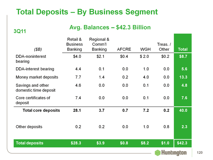 | Total Deposits - By Business Segment Total Deposits - By Business Segment Avg. Balances - $42.3 Billion 3Q11 120 |