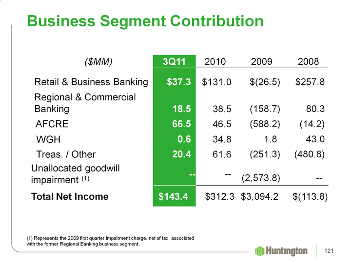 | Business Segment Contribution ($MM) 3Q11 2010 2009 2008 Retail & Business Banking $37.3 $131.0 $(26.5) $257.8 Regional & Commercial Banking 18.5 38.5 (158.7) 80.3 AFCRE 66.5 46.5 (588.2) (14.2) WGH 0.6 34.8 1.8 43.0 Treas. / Other 20.4 61.6 (251.3) (480.8) Unallocated goodwill impairment (1) -- -- (2,573.8) -- Total Net Income $143.4 $312.3 $3,094.2 $(113.8) (1) Represents the 2009 first quarter impairment charge, net of tax, associated with the former Regional Banking business segment. 121 |