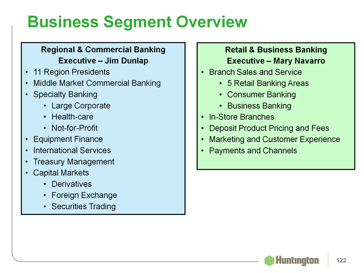 | Business Segment Overview Regional & Commercial Banking Executive - Jim Dunlap 11 Region Presidents Middle Market Commercial Banking Specialty Banking Large Corporate Health-care Not-for-Profit Equipment Finance International Services Treasury Management Capital Markets Derivatives Foreign Exchange Securities Trading Retail & Business Banking Executive - Mary Navarro Branch Sales and Service 5 Retail Banking Areas Consumer Banking Business Banking In-Store Branches Deposit Product Pricing and Fees Marketing and Customer Experience Payments and Channels 122 |