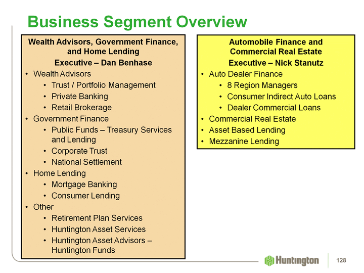| Business Segment Overview Wealth Advisors, Government Finance, and Home Lending Executive - Dan Benhase Wealth Advisors Trust / Portfolio Management Private Banking Retail Brokerage Government Finance Public Funds - Treasury Services and Lending Corporate Trust National Settlement Home Lending Mortgage Banking Consumer Lending Other Retirement Plan Services Huntington Asset Services Huntington Asset Advisors - Huntington Funds Automobile Finance and Commercial Real Estate Executive - Nick Stanutz Auto Dealer Finance 8 Region Managers Consumer Indirect Auto Loans Dealer Commercial Loans Commercial Real Estate Asset Based Lending Mezzanine Lending 128 |