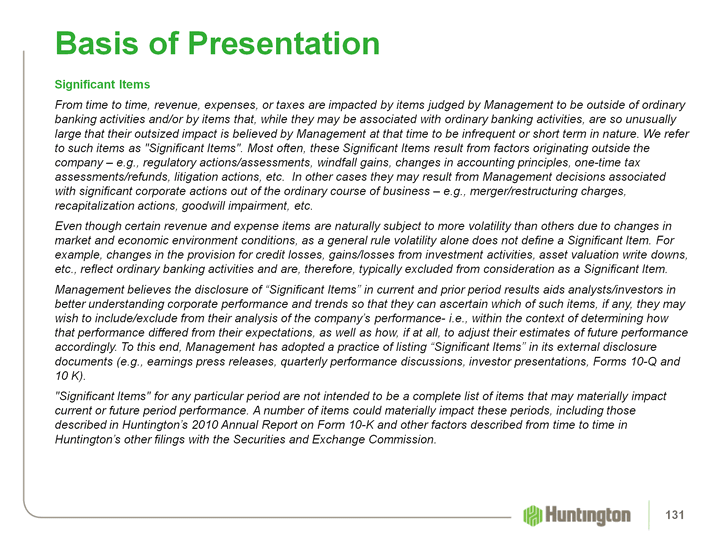 | Significant Items From time to time, revenue, expenses, or taxes are impacted by items judged by Management to be outside of ordinary banking activities and/or by items that, while they may be associated with ordinary banking activities, are so unusually large that their outsized impact is believed by Management at that time to be infrequent or short term in nature. We refer to such items as "Significant Items". Most often, these Significant Items result from factors originating outside the company - e.g., regulatory actions/assessments, windfall gains, changes in accounting principles, one-time tax assessments/refunds, litigation actions, etc. In other cases they may result from Management decisions associated with significant corporate actions out of the ordinary course of business - e.g., merger/restructuring charges, recapitalization actions, goodwill impairment, etc. Even though certain revenue and expense items are naturally subject to more volatility than others due to changes in market and economic environment conditions, as a general rule volatility alone does not define a Significant Item. For example, changes in the provision for credit losses, gains/losses from investment activities, asset valuation write downs, etc., reflect ordinary banking activities and are, therefore, typically excluded from consideration as a Significant Item. Management believes the disclosure of "Significant Items" in current and prior period results aids analysts/investors in better understanding corporate performance and trends so that they can ascertain which of such items, if any, they may wish to include/exclude from their analysis of the company's performance- i.e., within the context of determining how that performance differed from their expectations, as well as how, if at all, to adjust their estimates of future performance accordingly. To this end, Management has adopted a practice of listing "Significant Items" in its external disclosure documents (e.g., earnings press releases, quarterly performance discussions, investor presentations, Forms 10-Q and 10 K). "Significant Items" for any particular period are not intended to be a complete list of items that may materially impact current or future period performance. A number of items could materially impact these periods, including those described in Huntington's 2010 Annual Report on Form 10-K and other factors described from time to time in Huntington's other filings with the Securities and Exchange Commission. Basis of Presentation 131 |
