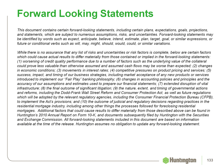 | This document contains certain forward-looking statements, including certain plans, expectations, goals, projections, and statements, which are subject to numerous assumptions, risks, and uncertainties. Forward-looking statements may be identified by words such as expect, anticipate, believe, intend, estimate, plan, target, goal, or similar expressions, or future or conditional verbs such as will, may, might, should, would, could, or similar variations. While there is no assurance that any list of risks and uncertainties or risk factors is complete, below are certain factors which could cause actual results to differ materially from those contained or implied in the forward-looking statements: (1) worsening of credit quality performance due to a number of factors such as the underlying value of the collateral could prove less valuable than otherwise assumed and assumed cash flows may be worse than expected; (2) changes in economic conditions; (3) movements in interest rates; (4) competitive pressures on product pricing and services; (5) success, impact, and timing of our business strategies, including market acceptance of any new products or services introduced to implement our "Fair Play" banking philosophy; (6) changes in accounting policies and principles and the accuracy of our assumptions and estimates used to prepare our financial statements; (7) extended disruption of vital infrastructure; (8) the final outcome of significant litigation; (9) the nature, extent, and timing of governmental actions and reforms, including the Dodd-Frank Wall Street Reform and Consumer Protection Act, as well as future regulations which will be adopted by the relevant regulatory agencies, including the Consumer Financial Protection Bureau (CFPB), to implement the Act's provisions; and (10) the outcome of judicial and regulatory decisions regarding practices in the residential mortgage industry, including among other things the processes followed for foreclosing residential mortgages. Additional factors that could cause results to differ materially from those described above can be found in Huntington's 2010 Annual Report on Form 10-K, and documents subsequently filed by Huntington with the Securities and Exchange Commission. All forward-looking statements included in this document are based on information available at the time of the release. Huntington assumes no obligation to update any forward-looking statement. Forward Looking Statements 133 |