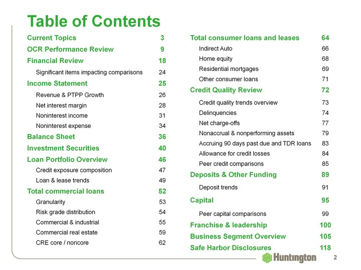 | Table of Contents Current Topics 3OCR Performance Review 9Financial Review 18 Significant items impacting comparisons 24Income Statement 25 Revenue & PTPP Growth 26 Net interest margin 28 Noninterest income 31 Noninterest expense 34Balance Sheet 36Investment Securities 40Loan Portfolio Overview 46 Credit exposure composition 47 Loan & lease trends 49Total commercial loans 52 Granularity 53 Risk grade distribution 54 Commercial & industrial 55 Commercial real estate 59 CRE core / noncore 62 Total consumer loans and leases 64 Indirect Auto 66 Home equity 68 Residential mortgages 69 Other consumer loans 71Credit Quality Review 72 Credit quality trends overview 73 Delinquencies 74 Net charge-offs 77 Nonaccrual & nonperforming assets 79 Accruing 90 days past due and TDR loans 83 Allowance for credit losses 84 Peer credit comparisons 85Deposits & Other Funding 89 Deposit trends 91Capital 95 Peer capital comparisons 99Franchise & leadership 100Business Segment Overview 105Safe Harbor Disclosures 118 2 |