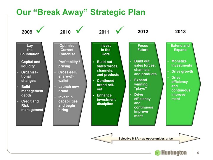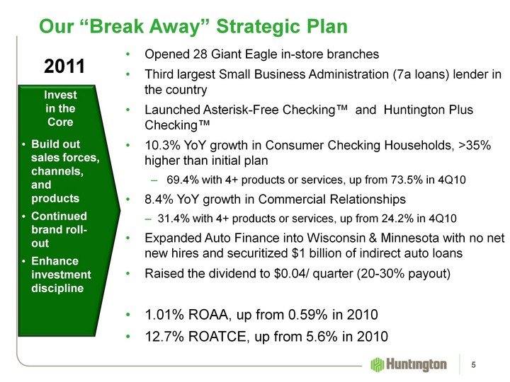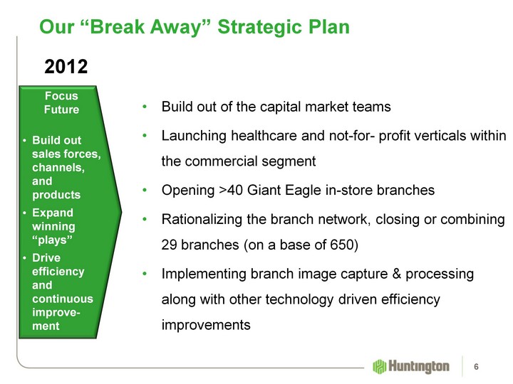 | Our "Break Away" Strategic Plan 5 Invest in theCoreBuild out sales forces, channels, and productsContinued brand roll- outEnhance investment discipline 2011 Opened 28 Giant Eagle in-store branchesThird largest Small Business Administration (7a loans) lender in the countryLaunched Asterisk-Free Checking(tm) and Huntington Plus Checking(tm)10.3% YoY growth in Consumer Checking Households, >35% higher than initial plan69.4% with 4+ products or services, up from 73.5% in 4Q108.4% YoY growth in Commercial Relationships31.4% with 4+ products or services, up from 24.2% in 4Q10Expanded Auto Finance into Wisconsin & Minnesota with no net new hires and securitized $1 billion of indirect auto loansRaised the dividend to $0.04/ quarter (20-30% payout)1.01% ROAA, up from 0.59% in 201012.7% ROATCE, up from 5.6% in 2010 |