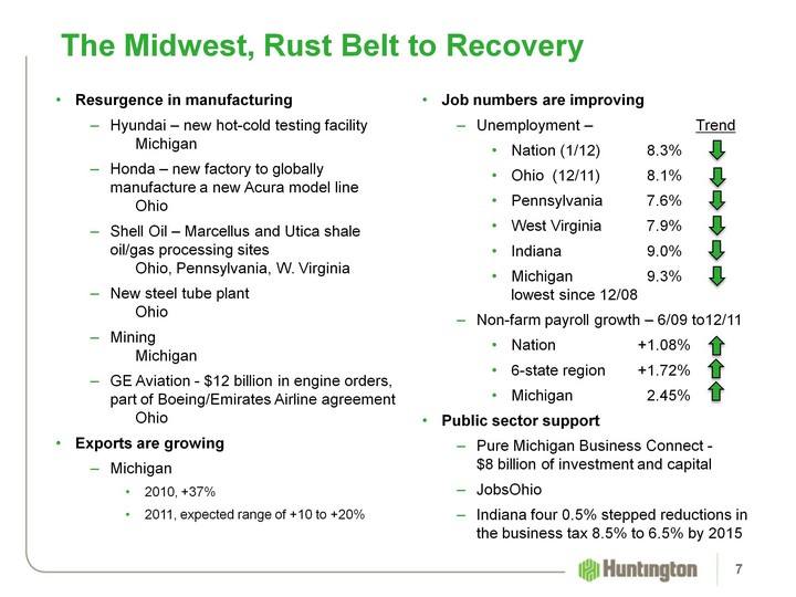 | Our "Break Away" Strategic Plan 6 Build out of the capital market teamsLaunching healthcare and not-for- profit verticals within the commercial segmentOpening >40 Giant Eagle in-store branchesRationalizing the branch network, closing or combining 29 branches (on a base of 650)Implementing branch image capture & processing along with other technology driven efficiency improvements Focus FutureBuild out sales forces, channels, and productsExpand winning "plays"Drive efficiency and continuous improve- ment 2012 |