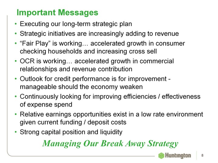 | Important Messages Executing our long-term strategic planStrategic initiatives are increasingly adding to revenue"Fair Play" is working... accelerated growth in consumer checking households and increasing cross sellOCR is working... accelerated growth in commercial relationships and revenue contributionOutlook for credit performance is for improvement - manageable should the economy weakenContinuously looking for improving efficiencies / effectiveness of expense spendRelative earnings opportunities exist in a low rate environment given current funding / deposit costsStrong capital position and liquidityManaging Our Break Away Strategy 8 |