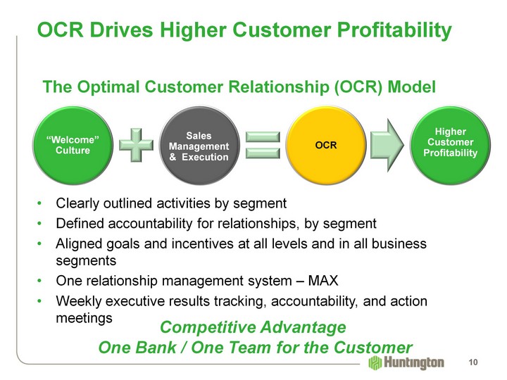 | OCR Drives Higher Customer Profitability Clearly outlined activities by segmentDefined accountability for relationships, by segmentAligned goals and incentives at all levels and in all business segmentsOne relationship management system - MAXWeekly executive results tracking, accountability, and action meetings Competitive Advantage One Bank / One Team for the Customer The Optimal Customer Relationship (OCR) Model "Welcome" Culture Sales Management & Execution OCR Higher Customer Profitability 10 |