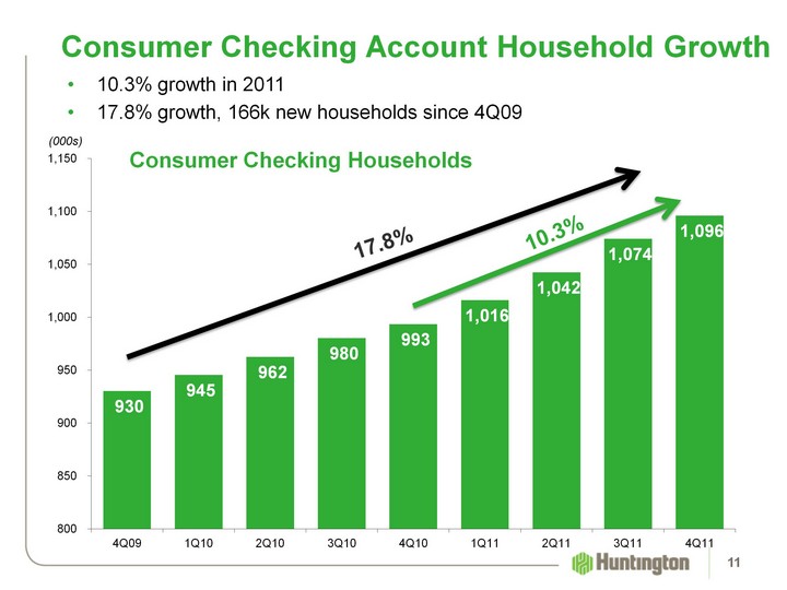 | (CHART) Consumer Checking Account Household Growth Consumer Checking Households 10.3% 10.3% growth in 201117.8% growth, 166k new households since 4Q09 (000s) 11 17.8% |