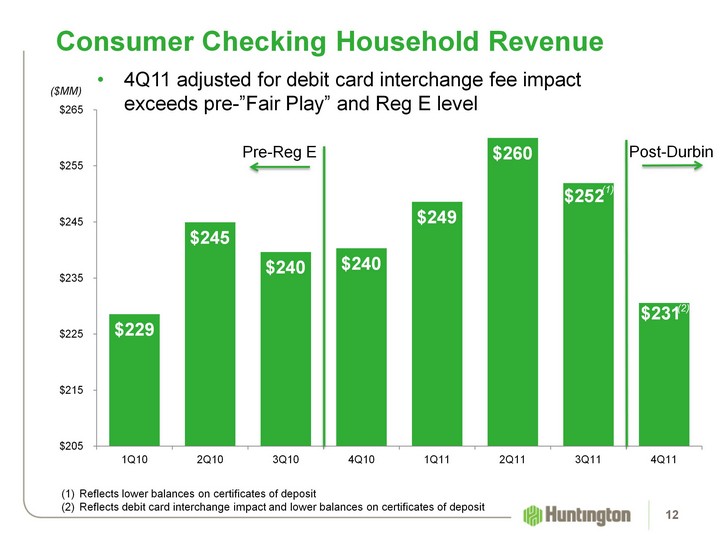 | Consumer Checking Household Revenue (CHART) (1) ($MM) 4Q11 adjusted for debit card interchange fee impact exceeds pre-"Fair Play" and Reg E level 12 Pre-Reg E Reflects lower balances on certificates of deposit Reflects debit card interchange impact and lower balances on certificates of deposit (2) Post-Durbin |