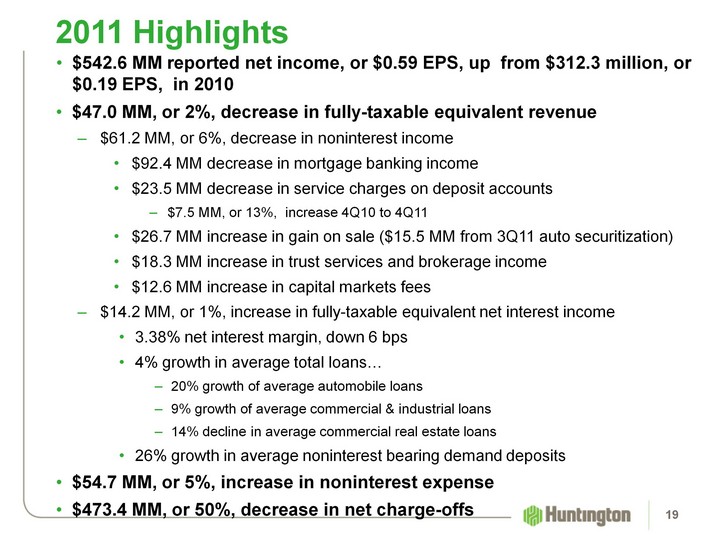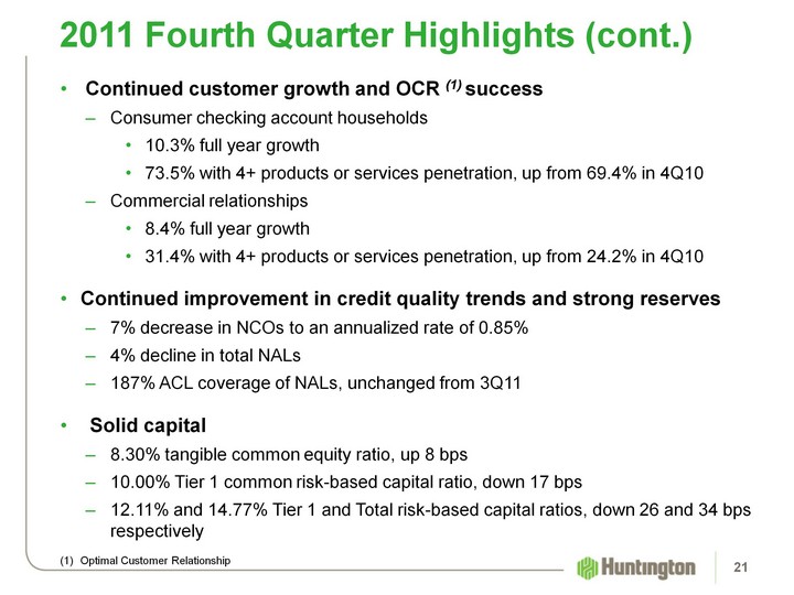 | $126.9 MM reported net income, or $0.14 EPS0.92% return on average assets11.2% return on average tangible common equity$20.8 MM, or 3%, decrease in fully-taxable equivalent revenue$29.2 MM, or 11%, decrease in noninterest income$17.3 MM debit card interchange reduction related to Durbin Amendment$15.5 MM of 3Q11 auto loan securitization gain $6.4 MM on Visa(r) related derivative loss$11.3 MM increase in mortgage banking income$8.4 MM, or 2%, increase in fully-taxable equivalent net interest income3.38% net interest margin, up 4 bps2% annualized growth in average total loans... 16% annualized growth of average commercial & industrial loansStrong originations in automobile loans impacted by 3rd quarter securitization56% annualized growth in average total demand deposits$8.8 MM, or 2%, decrease in noninterest expense$9.7 million gain on the early extinguishment of debt 2011 Fourth Quarter Highlights 20 |
