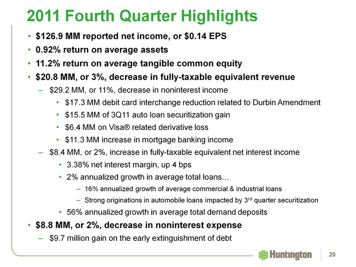 | $542.6 MM reported net income, or $0.59 EPS, up from $312.3 million, or $0.19 EPS, in 2010$47.0 MM, or 2%, decrease in fully-taxable equivalent revenue$61.2 MM, or 6%, decrease in noninterest income$92.4 MM decrease in mortgage banking income$23.5 MM decrease in service charges on deposit accounts$7.5 MM, or 13%, increase 4Q10 to 4Q11$26.7 MM increase in gain on sale ($15.5 MM from 3Q11 auto securitization)$18.3 MM increase in trust services and brokerage income$12.6 MM increase in capital markets fees$14.2 MM, or 1%, increase in fully-taxable equivalent net interest income3.38% net interest margin, down 6 bps4% growth in average total loans... 20% growth of average automobile loans9% growth of average commercial & industrial loans14% decline in average commercial real estate loans26% growth in average noninterest bearing demand deposits$54.7 MM, or 5%, increase in noninterest expense$473.4 MM, or 50%, decrease in net charge-offs 2011 Highlights 19 |