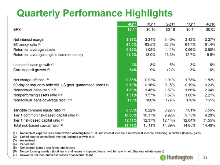 | Continued customer growth and OCR (1) successConsumer checking account households10.3% full year growth 73.5% with 4+ products or services penetration, up from 69.4% in 4Q10Commercial relationships8.4% full year growth31.4% with 4+ products or services penetration, up from 24.2% in 4Q10Continued improvement in credit quality trends and strong reserves7% decrease in NCOs to an annualized rate of 0.85%4% decline in total NALs187% ACL coverage of NALs, unchanged from 3Q11Solid capital8.30% tangible common equity ratio, up 8 bps10.00% Tier 1 common risk-based capital ratio, down 17 bps12.11% and 14.77% Tier 1 and Total risk-based capital ratios, down 26 and 34 bps respectively 2011 Fourth Quarter Highlights (cont.) Optimal Customer Relationship 21 |