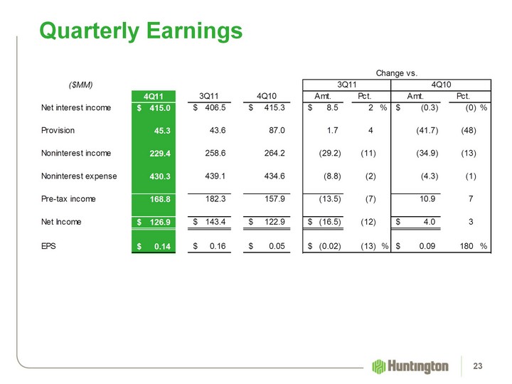 | Quarterly Performance Highlights 4Q11 3Q11 2Q11 1Q11 4Q10 EPS $0.14 $0.16 $0.16 $0.14 $0.05 Net interest margin 3.38% 3.34% 3.40% 3.42% 3.37% Efficiency ratio (1) 64.0% 63.5% 62.7% 64.7% 61.4% Return on average assets 0.92% 1.05% 1.11% 0.96% 0.90% Return on average tangible common equity 11.2% 13.0% 13.3% 12.7% 5.6% Loan and lease growth (2) 2% 8% 5% 3% 6% Core deposit growth (2) 14% 9% (2)% 3% 10% Net charge-off ratio (3) 0.85% 0.92% 1.01% 1.73% 1.82% 90-day delinquency ratio xld. US govt. guaranteed loans (4) 0.19% 0.16% 0.15% 0.19% 0.23% Nonaccrual loans ratio (4,5) 1.39% 1.45% 1.57% 1.66% 2.04% Nonperforming assets ratio (4,6) 1.51% 1.57% 1.67% 1.80% 2.21% Nonaccrual loans coverage ratio (4,7) 178% 180% 174% 178% 161% Tangible common equity ratio (4) 8.30% 8.22% 8.22% 7.81% 7.56% Tier 1 common risk-based capital ratio (4) 10.00% 10.17% 9.92% 9.75% 9.29% Tier 1 risk-based capital ratio (4) 12.11% 12.37% 12.14% 12.04% 11.55% Total risk-based capital ratio (4) 14.77% 15.11% 14.89% 14.85% 14.46% (1) Noninterest expense less amortization of intangibles / FTE net interest income + noninterest income excluding securities (losses) gainsLinked-quarter annualized average balance growth rateAnnualizedPeriod endNonaccrual loans / total loans and leasesNonperforming assets / (total loans and leases + impaired loans held for sale + net other real estate owned)Allowance for loan and lease losses / nonaccrual loans 22 |