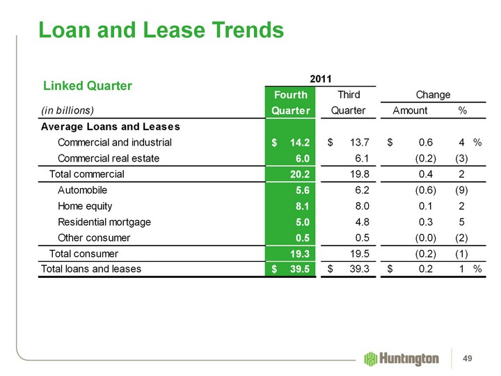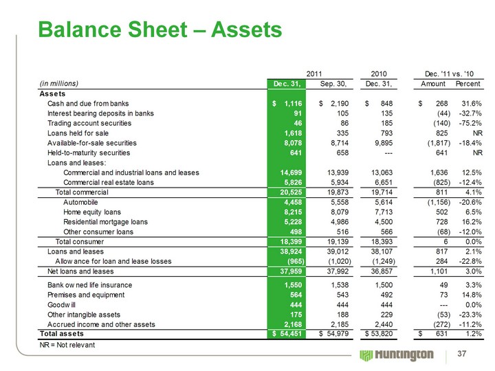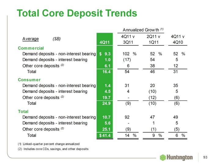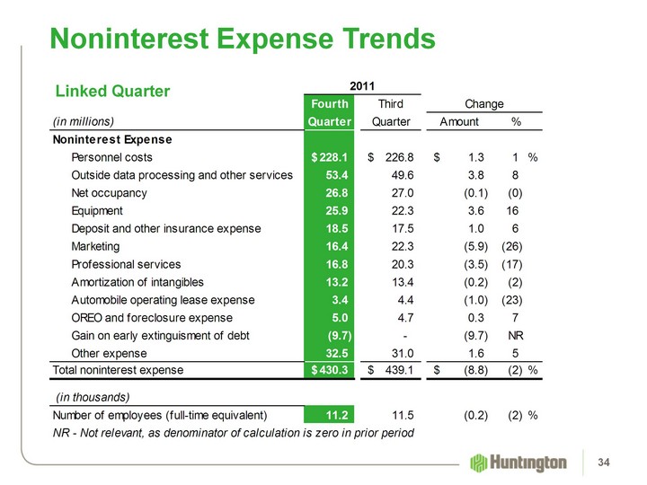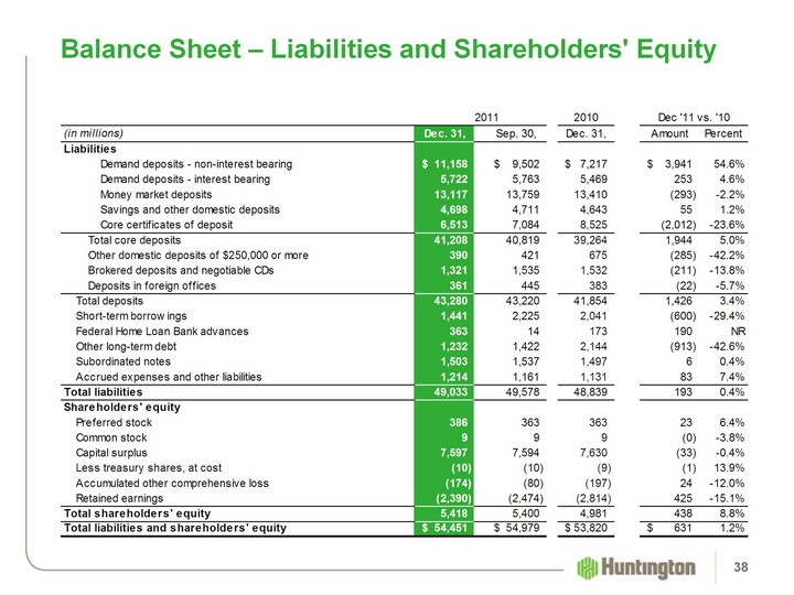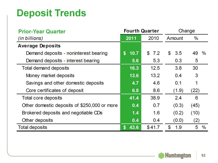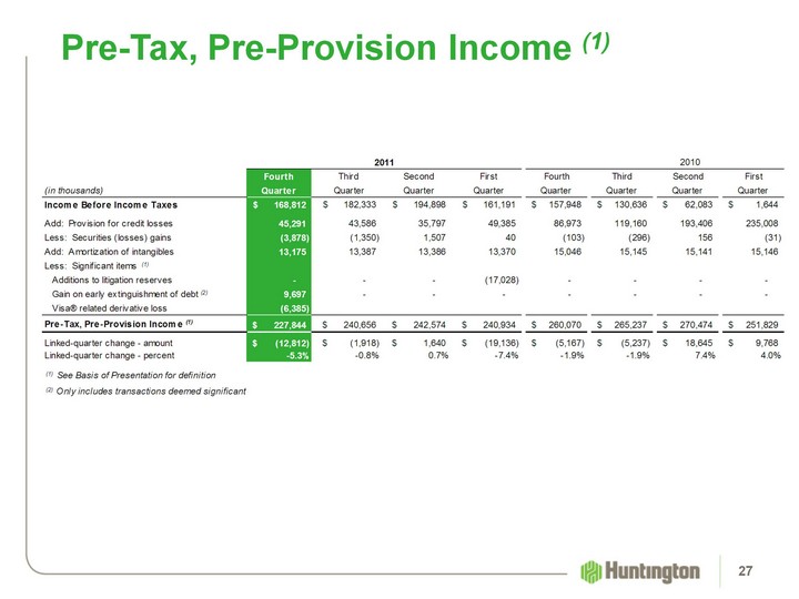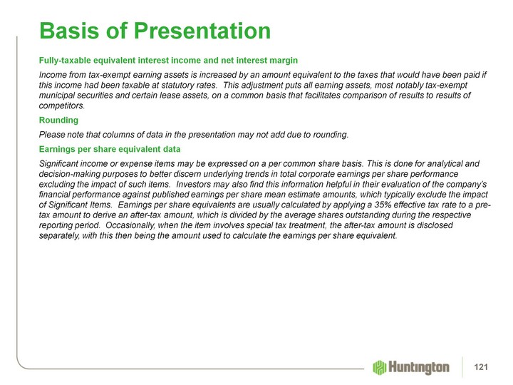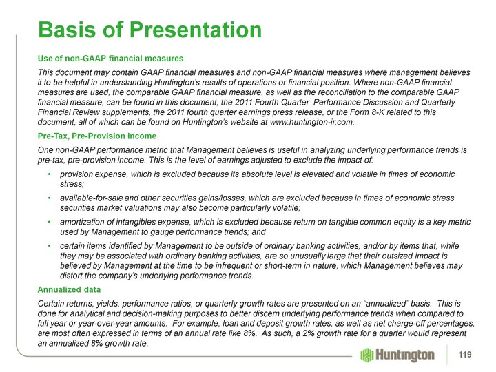 | Use of non-GAAP financial measuresThis document may contain GAAP financial measures and non-GAAP financial measures where management believes it to be helpful in understanding Huntington's results of operations or financial position. Where non-GAAP financial measures are used, the comparable GAAP financial measure, as well as the reconciliation to the comparable GAAP financial measure, can be found in this document, the 2011 Fourth Quarter Performance Discussion and Quarterly Financial Review supplements, the 2011 fourth quarter earnings press release, or the Form 8-K related to this document, all of which can be found on Huntington's website at www.huntington-ir.com.Pre-Tax, Pre-Provision IncomeOne non-GAAP performance metric that Management believes is useful in analyzing underlying performance trends is pre-tax, pre-provision income. This is the level of earnings adjusted to exclude the impact of:provision expense, which is excluded because its absolute level is elevated and volatile in times of economic stress;available-for-sale and other securities gains/losses, which are excluded because in times of economic stress securities market valuations may also become particularly volatile;amortization of intangibles expense, which is excluded because return on tangible common equity is a key metric used by Management to gauge performance trends; and certain items identified by Management to be outside of ordinary banking activities, and/or by items that, while they may be associated with ordinary banking activities, are so unusually large that their outsized impact is believed by Management at the time to be infrequent or short-term in nature, which Management believes may distort the company's underlying performance trends.Annualized dataCertain returns, yields, performance ratios, or quarterly growth rates are presented on an "annualized" basis. This is done for analytical and decision-making purposes to better discern underlying performance trends when compared to full year or year-over-year amounts. For example, loan and deposit growth rates, as well as net charge-off percentages, are most often expressed in terms of an annual rate like 8%. As such, a 2% growth rate for a quarter would represent an annualized 8% growth rate. Basis of Presentation 119 |