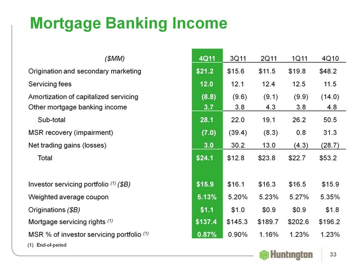 | Mortgage Banking Income ($MM) 4Q11 3Q11 2Q11 1Q11 4Q10 Origination and secondary marketing $21.2 $15.6 $11.5 $19.8 $48.2 Servicing fees 12.0 12.1 12.4 12.5 11.5 Amortization of capitalized servicing (8.8) (9.6) (9.1) (9.9) (14.0) Other mortgage banking income 3.7 3.8 4.3 3.8 4.8 Sub-total 28.1 22.0 19.1 26.2 50.5 MSR recovery (impairment) (7.0) (39.4) (8.3) 0.8 31.3 Net trading gains (losses) 3.0 30.2 13.0 (4.3) (28.7) Total $24.1 $12.8 $23.8 $22.7 $53.2 Investor servicing portfolio (1) ($B) $15.9 $16.1 $16.3 $16.5 $15.9 Weighted average coupon 5.13% 5.20% 5.23% 5.27% 5.35% Originations ($B) $1.1 $1.0 $0.9 $0.9 $1.8 Mortgage servicing rights (1) $137.4 $145.3 $189.7 $202.6 $196.2 MSR % of investor servicing portfolio (1) 0.87% 0.90% 1.16% 1.23% 1.23% (1) End-of-period 33 |
